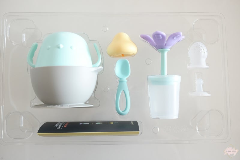 꼬꼬그릇, 컵세트 츄츄블룸 치발기리베베 베이비스푼 3종세트 꼬꼬컵, 꼬꼬그릇, 베이비컵, 실리콘스푼 꽃칫솔, 칫솔, 주스.