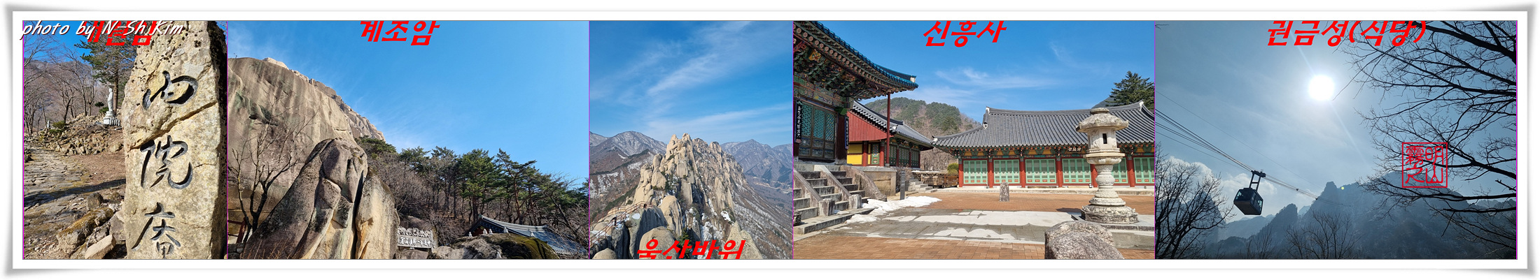등산코스 : 소공원 – (2.4km, 40분) – 내원암 – (0.9km, 분) – 계조암 – (0.8km, 60분) – 울산바위 – (2.9km, 80분) – 신흥사 ) 탐방) -(0.8km, 20분)- 권금성(식당)