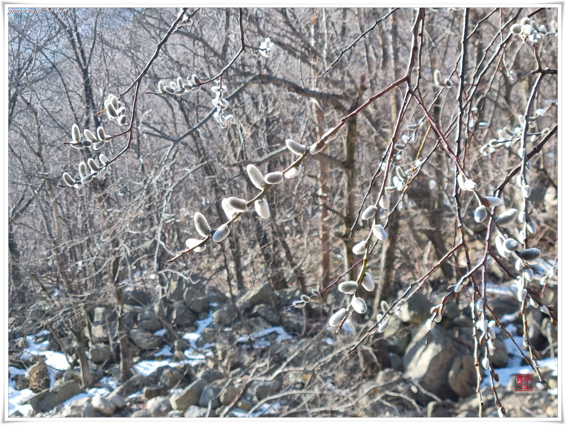 이미 계곡 한쪽에는 봄꽃에 지지 않는다는 버드나무 강아지들이 윤기나고 윤기나는 털을 빛내며 봄바람에 춤을 추고 있다.